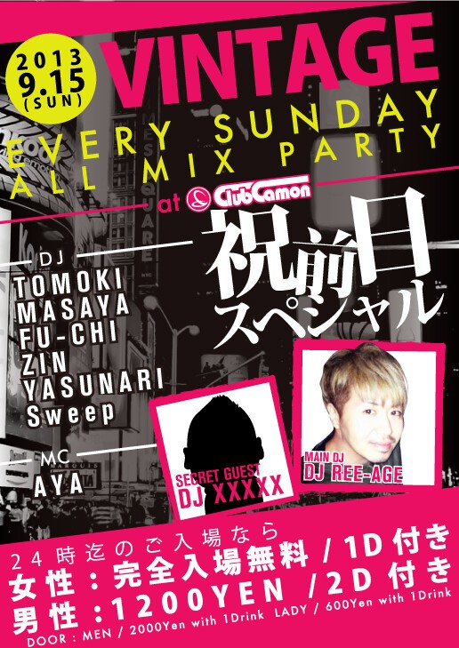 【毎週日曜オールジャンル】9/15☆祝前日SP★★話題沸騰!!日曜カモンは毎週大盛況のオールミックスパーティー『VINTAGE』☆☆24時まで女性完全入場無料★★