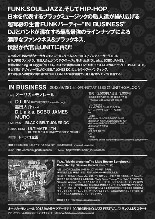 伝説創造への意欲に満ち溢れたBUSINESSマン達による、全てのブラックミュージックLOVERSが楽しめるヒップでファンキーでソウルフルそしてセクシーと、全てが最高の状態で揃う「温故知新」な最強パーティー"IN BUSINESS"が代官山でその正真正銘"ホンモノ"のステージを見せつける!