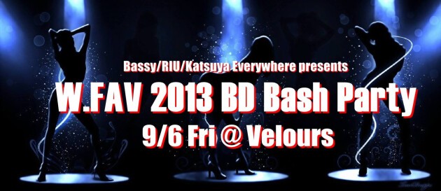 ハイエンドでスペクタクルなパーティをお届けしているW.FAV(ダブルフェイヴ)。2013AWシーズンのキックオフはW.FAVのプラチナムクルーのひとりRIU(Nallow Brochure)のBD Bashパーティを筆頭に9月生まれのみなさんにスペシャルサービスもご提供しちゃいます!9月に誕生日を迎えるお客様は無料でご招待!同伴のグループ全員にスペシャルドリンクのサービスをご用意しましたので、みんなで一緒にバースデーバッシュを楽しみましょう!RIUの誕生日を祝したセレモニープレイに加え、ミュージックセレクター、ダンサーもBD Bashにふさわしく、キャッチー&セクシー!世界を舞台に活躍するKatsuya Everywhereの帰国最初のGIGも見逃せません!W.FAVはジャンルを越えて、クオリティの高いミュージックセレクションとベロアのクオリティ感あふれる雰囲気のマリアージュで都内でも指折りの「心地よさ」を提供しています。楽しんで、和んで、すてきなVibesに包まれて、最高の一夜を贈ります。