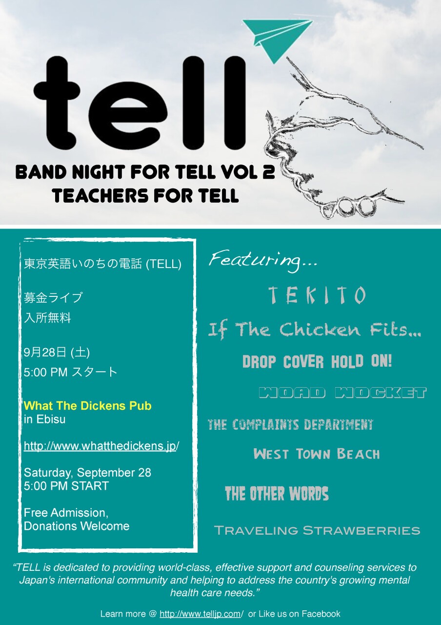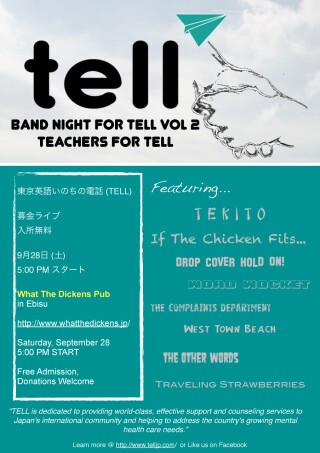 Join TELL for an enjoyable night of music at this awareness and fundraising event, featuring Kanto Plain international school faculty bands performing in support of the Tokyo English Life Line. 音楽の中で東京英語いのちの電話 (TELL) をもっと分かりましょう。