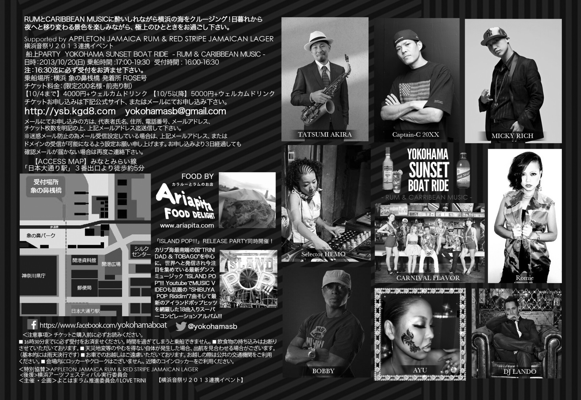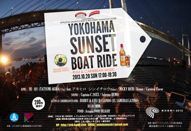 横浜の日暮れから夜へと移り変わる景色を堪能しながらクルージング!レゲエ、ソカ、ラテン、サルサなどカリブ全般のミュージックを楽しみながらカリブのお酒を味わい、暫しの時間日常から解放されにきてはいかがでしょうか。サックス&ギターのアコースティックライブもございます。また横浜で9/20~11/30に開催される「横浜音祭り2013」との連携イベントとなっております。是非、横浜へ遊びにいらして下さい。