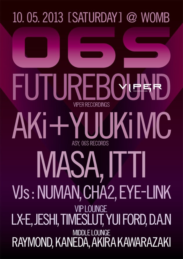 06S continues to lead the scene with its fastest and the best groove in 2013. This month’s 06S will see the wild horse, Futurebound of Viper Recordings from Liverpool as a special guest. Futurebound has found a numerous big artists such as Nero, DC Breaks, Camo & Krooked, Metric, ShockOne to name a few, and also has left a massive impact on the scene by compiling around 40 tracks for “Drum ‘n’ Bass Summer Slammer 2011”, which was released from Viper two years ago. “Cyber Funk” and “Shifting Sands” featured on “Blinded by the Light EP” of Smooth that was released last year, have already been gathering attentions. The perfect harmony of Futurebound’s distinctive sound and Viper tracks is a must-see for this event!
