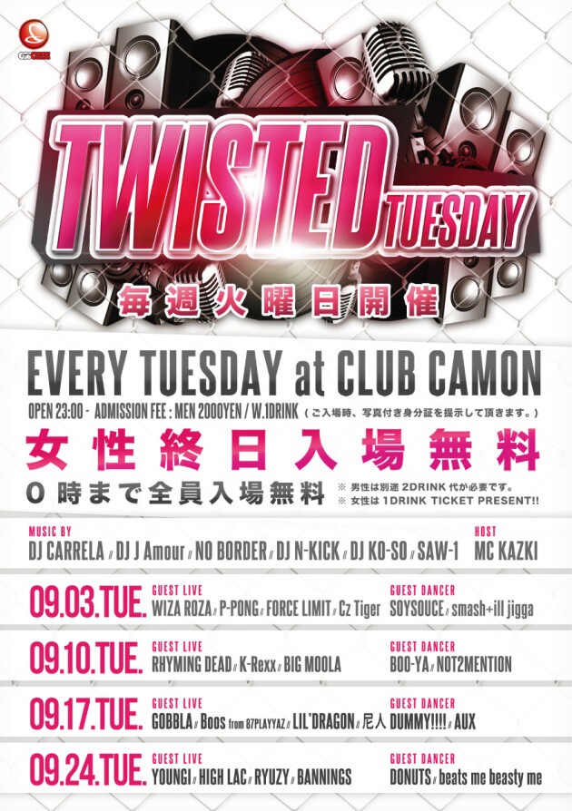 【毎週火曜ツイチュー】人気沸騰中!!火曜カモンはSTRAIGHT HIP HOP PARTY『TWISTED TUESDAY』☆☆毎週豪華LIVE&DANCERをゲストに迎えて平日の大阪クラブシーンをHIP HOPで巻き込み中!!!!24時まで全員入場無料&女性は1Dプレゼント★★