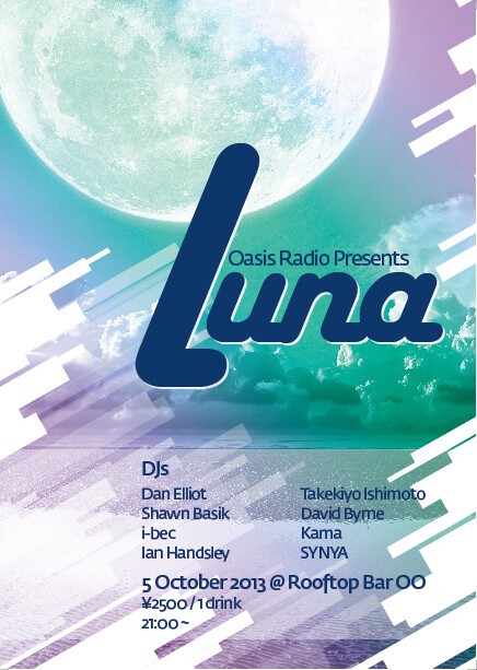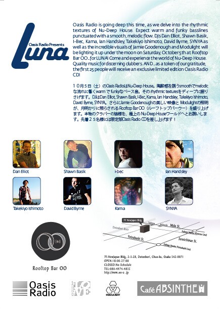 Oasis Radio is going deep this time as we delve into the rhythmic textures of Nu-Deep House. Expect warm and funky basslines punctuated with a smooth, melodic flow. DJs Dan Elliot, Shawn Basik, I-Bec, Kama, Ian Handsley, Takekiyo Ishimoto, David Byrne, SYNYA, as well as the incredible visuals of Jamie Goodenough and Modulight will be lighting it up under the moon on Saturday, October 5th at Rooftop Bar OO...for LUNA! Quality music for discerning clubbers.