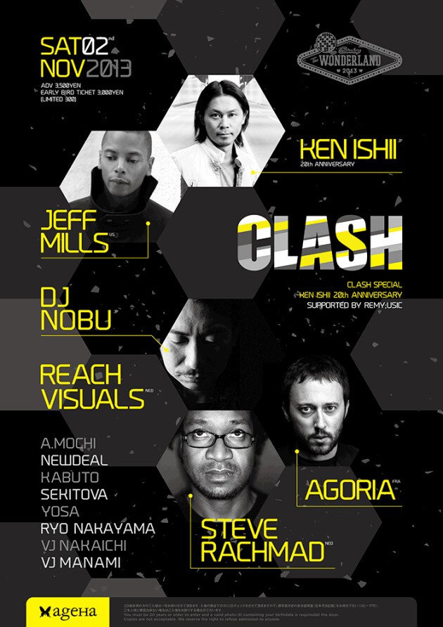 ageHaを代表するモンスターテクノパーティーCLASHにジェフ・ミルズが初登場!20周年を迎えたKEN ISHIIをはじめ、アゴリア、スティーヴ・ラフマット、DJ NOBUら夢のようなラインナップの共演が実現するCLASHスペシャル!!!!