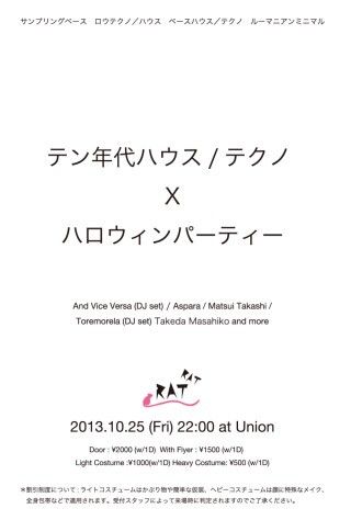 ブルックリンで勃興する地下ハウス/テクノ、ロンドンではダブステップを始めとしたベースミュージックとリンクするテクノ/ハウス、ルーマニアでは新しい形のミニマルシーンが発展。インターネットの発展が逆に都市の固有性を浮き彫りにする形となり、ますます加速するエレクトロニックミュージック。それらに共振する関西随一の早耳DJたちと、日本でももはや定着した感のある、年に一度のお祭りのハロウィンパーティ。今回は、コスプレ具合によって料金が変わるユニークなディスカウントシステムを用意しております。(強烈なコスプレは1Dのみ!)ぜひ心よりお待ちしています。