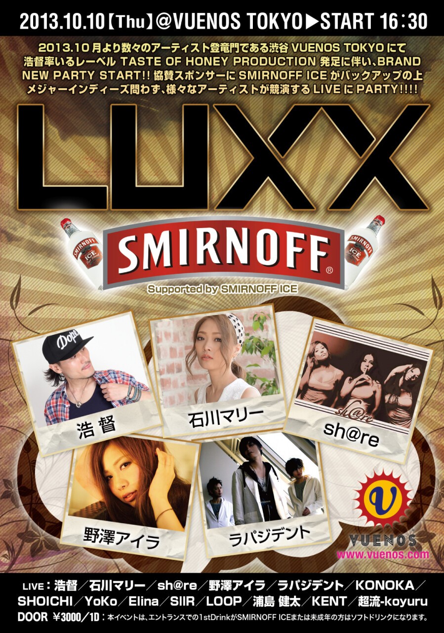 浩督率いるTASTE OF HONEY PRODUCTION発足に伴い、数々のアーティストの登竜門である渋谷VUENOSにて Brand New LIVE PartyがSTART!!!!これからの渋谷のシーンにて、メジャー・インディーズ問わず、様々なジャンルのアーティストが共演するSPECIAL LIVE PARTY!! このPARTYでしか見れないSPECIALなコラボレーションも実現!!!!そして、現在TV CMなどでおなじみの有名飲酒ドリンク【SMIRNOFF ICE】がバックアップ!!!!!!!!!!!