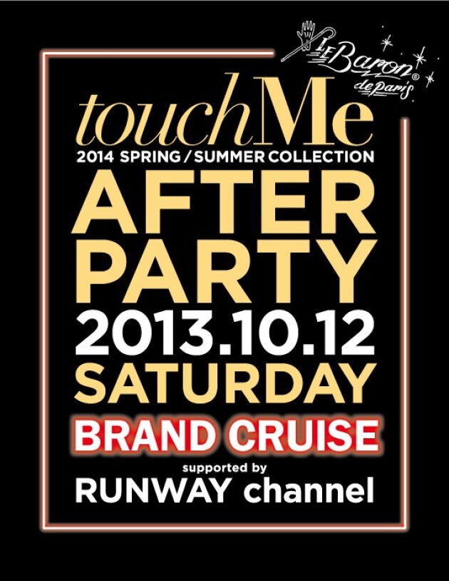 前回3万人の動員を記録したtouchMe。今回Le Baron de Parisで開催するtouchMeアフターパーティーでは、2014年春夏コレクション“touchMe Film Collection”の他、 最新コレクションの映像をいち早く公開。また、”TOKYO BRAND CRUISING“とスナップサイトTokyoFashionSnap協力の元、例年よりも一段と華やかな夜をお届けいたします。さらにはスナップ撮影にご参加して頂いた女性客から抽選で5名2組様(総勢10名)に”TOKYO BRAND CRUISING“のクルージングご招待券をプレゼント!!お誘い合わせのうえ、思いっ切り着飾って遊びにいらしてください!