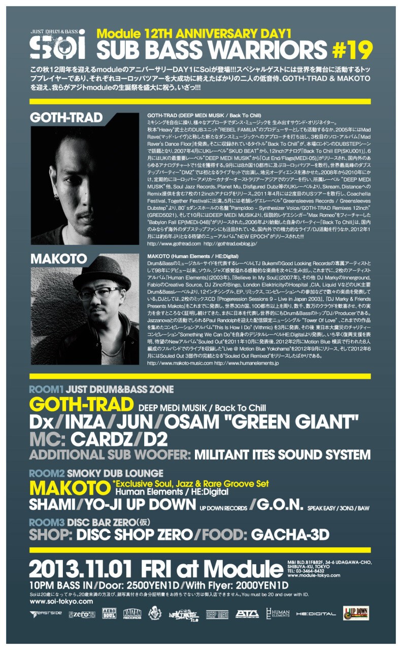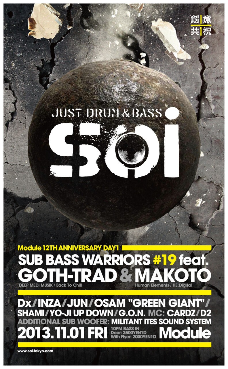 この秋12周年を迎えるmoduleのアニバーサリーDAY1にSoiが登場!!! ゲストには世界を舞台に活動するトッププレイヤーであり、それぞれヨーロッパツアーを大成功に終えたばかりの二人の低音侍、GOTH-TRAD & MAKOTOを迎え、我らがアジトmoduleの生誕祭を盛大に祝う。いざっ!!!