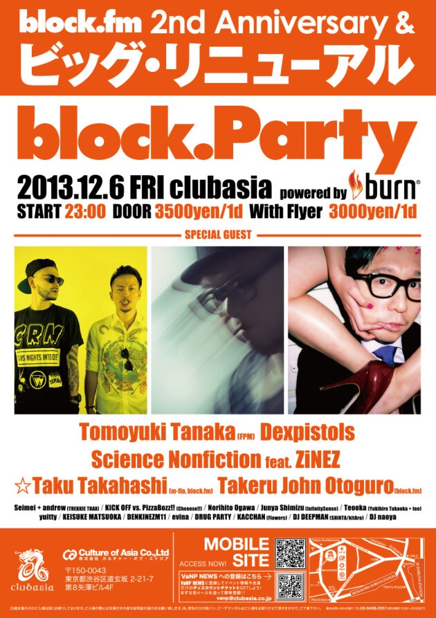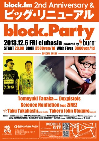 12月のThe Block Partyは「block.fm」の2周年と「ビッグ・リニューアル」を記念し、"Hyper Society"からTomoyuki Tanaka (FPM)、そしてDexpistolsを迎え、盛大に2013年最後のパーティーを彩る。また4月に衝撃を与えたばかりのScience Nonfictionによる、ZiENZをフィーチャーした新たな非現実的空間も披露される。