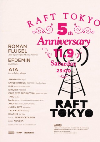 2008年からの活動を開始し、瞬く間に東京のシーンを席巻した RAFT TOKYO が5周年を迎える。この記念すべき祝祭に登場するのは ROMAN FLUGEL、EFDEMIN、ATA の三組。また国内からは、RAFT TOKYO の5年間の活動を支えたメンバー達が勢揃いした。来日する三人のアーティストと比べても遜色ないほど豪華なラインナップは見逃すわけにはいかないだろう。しかしながら急速に拡大し活動してきた RAFT TOKYO はこの5周年のアニバーサリーパーティーを一区切りとして、活動休止を宣言する。彼らの過ごした5年間の集大成とも言えるこのパーティーは、メンバーにとっても、そして皆さんにとっても特別な一夜になることを約束しよう。