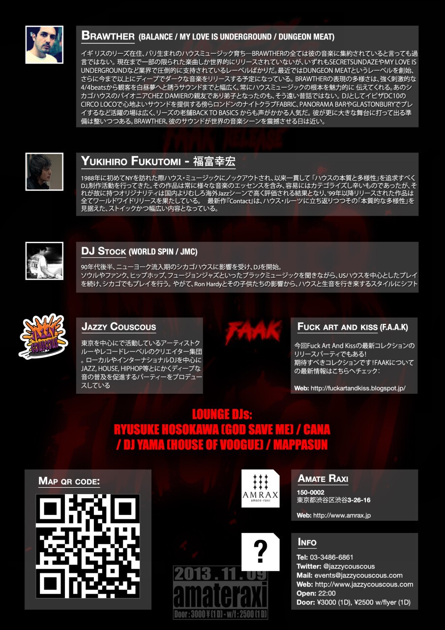 Jazzy Couscousが今回ヨーロッパのディープハウスシーンを盛り上げているBRAWTHERを日本に招致します!!Chez Damierに見初められしディープ・ハウスの新世代として注目を集め、リリースある毎に必ず高い評価を得ているBRAWTHERが今回 ハウスシーンの歴史を作ってきた福富幸宏と初共演!!ヨーロッパのハウスシーンのニューフェイスに国内のハウスシーンを牽引してきた福富氏の