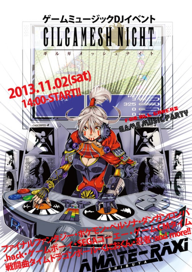 20代~30代のゲーム・キッズ達に送るRPG・原曲中心ゲームミュージックDJイベント「ギルガメッシュナイト」。2フロア構成で展開されるゲーム音×ゲーム音のお祭り。B2FのメインフロアはRPG曲中心、ラウンジ1FはRPG以外のTHE・ゲームミュージックで彩られます。メインフロアで暴れるもよし、ラウンジでゲームミュージックを肴にゲーム話に花を咲かせ酒を飲むのも良し。