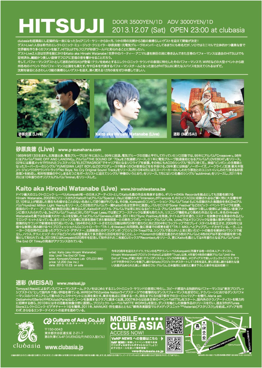 そして、パフォーマンスゲストとして迷彩が登場!テクノを始めとするエレクトロニック・サウンドの表現に特化したそのパフォーマンスで、WIREなどの大型イベントから欧州各地のイベントでのパフォーマンス出演をも果たす。今や日本を代表するパフォーマンスチームとなった彼らがHITSUJIに新たなスパイスを加えてくれるはずだ。