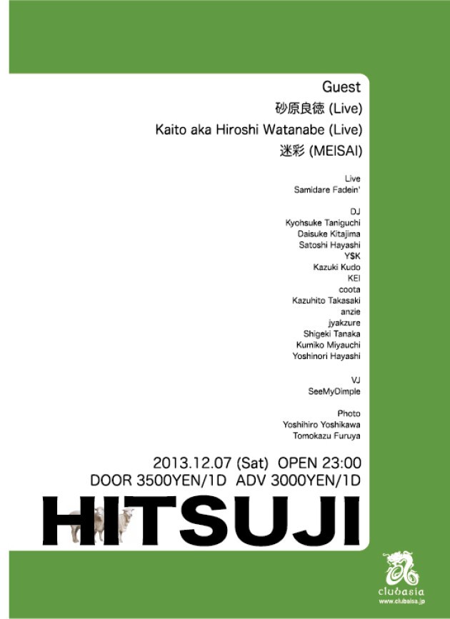 ゲストlive1人目は希代のエレクトロニック•ミュージック•クリエイター砂原良徳!元電気グルーヴのメンバーとしてあまりにも有名だが、ソロではミニマルで立体的かつ優美な音で世界観を作り多くのファンを魅了。HITSUJIでもフロアが砂原ワールドに彩られることを期待したい。