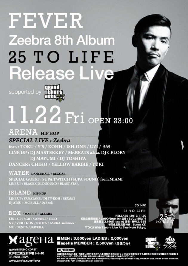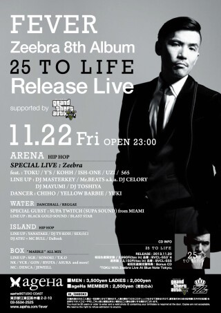 今年活動25周年を迎えた日本を代表するラッパー、Zeebraが2年ぶりとなる8作目のアルバム『25 to Life』をリリース。そのリリースを記念して、世界中で大人気のクライムアクションゲームシリーズのGrand Theft Autoのサポートにより、FEVERにてリリース・ライブを開催! アルバムに参加しているアーティストも参戦し、ARENAでリリースをお祝い。25年間のキャリアに裏付けされたスキルフルかつ迫力あるステージを見逃すな! WATERは、マイアミのレゲエシーンで長年トップに君臨する超人気サウンド、SUPA SOUNDのSUPA TWITCHをフィーチャー! マイアミのパーティヴァイブスをageHaのプールサイドで体験できる貴重な一夜。テントエリアのBOX、ラウンジのISLANDでもスペシャルなパーティを開催。