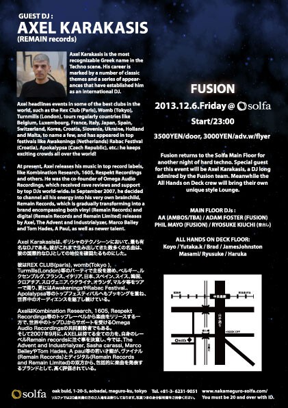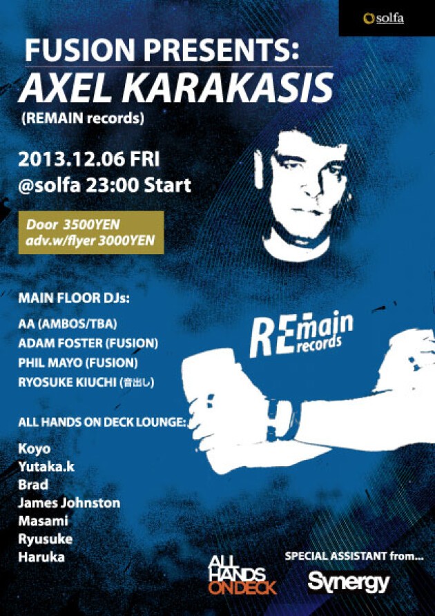 Fusion returns to the Solfa Main Floor for another night of hard techno. Special guest for this event will be Axel Karakasis, a DJ long admired by the Fusion team. Axel Karakasis is the most recognisable Greek name in the Techno scene and has headlined events in some of the best clubs in the world, such as the Rex Club in Paris, Womb in Tokyo and Turnmills in London. Meanwhile the All Hands on Deck Crew will bring their own unique style to the Lounge.