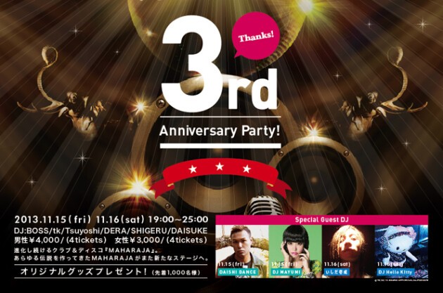 MAHARAJA3周年記念パーティ!ゲストにDAISHI DANCE、DJ MAYUMI、DJ いしだ壱成、DJ Hello KItty(DJ ハローキティ)を迎え、豪華に開催☆