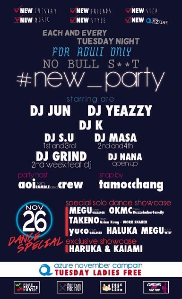 <DJ>DJ JUN / DJ YEAZZY / DJ K / DJ S.U (1st , 3rd week) / DJ MASA (2nd , 4th week) / DJ NANA