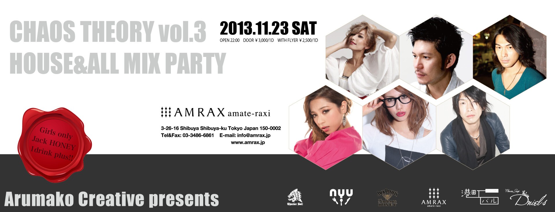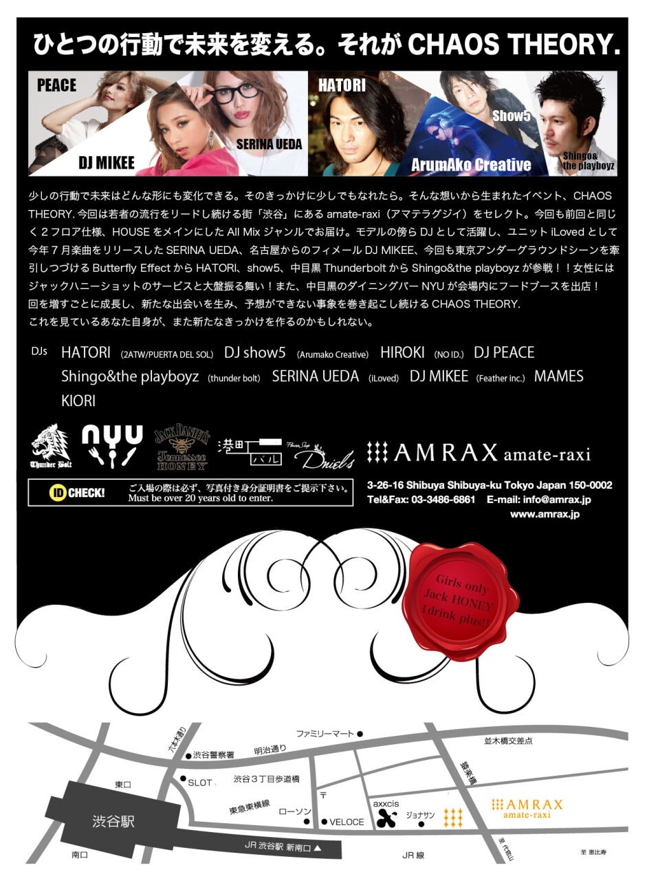 モデルの傍らDJとして活躍し、ユニットiLovedとして今年7月楽曲をリリースしたSERINA UEDA、名古屋からのフィメールDJ MIKEE、今回も東京アンダーグラウンドシーンを牽引しつづけるButterfly EffectからHATORI、show5、中目黒ThunderboltからShingo&the playboyzが参戦!!