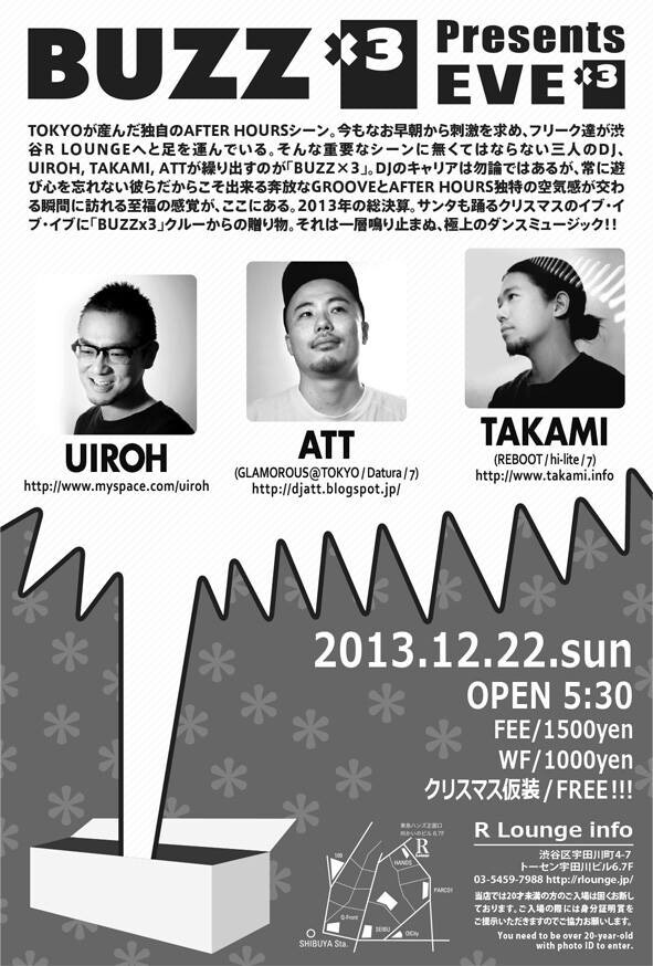 そんな重要なシーンに無くてはならない三人のDJ、UIROH, TAKAMI, ATTが繰り出すのが「BUZZ×3」