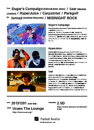 今後リリース予定のあるHyperJuice(fazerock & hara)、Mop of HeadのGeorgeらが参加するtaarのライブセット、大阪からSugar's Campaign(Seiho & Avec Avec)、横浜の兄弟DubstepユニットSeimei&TaimeiのTaimeiによる別名義Carpainter、北海道のトラックメイカーParkgolfらのライブとDJに日本を代表するネットレーベルMaltine Records主宰tomad、老舗ラガベースクルーMidnight Rockらが出演する。