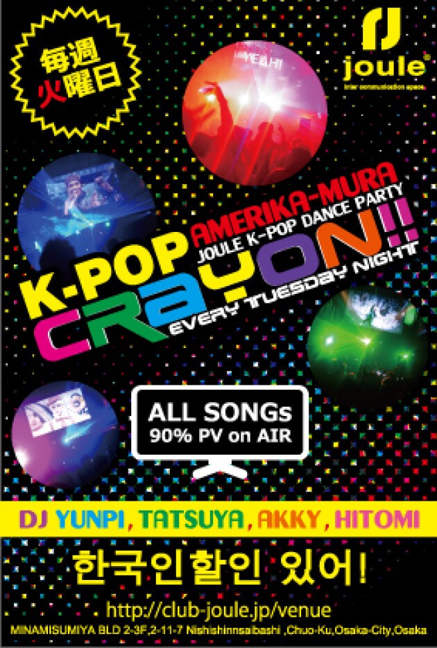 BIGBANGやカンナムスタイルや2NE1の人気により週末のAllMix Partyで普通にプレイされるようになったK-POPですが、とうとうジュールでもK-POPだけのイベントをこの春からのんびりはじめようと思います(^^)…とはいえあまり深く考えずにみんなが知ってるわかりやすいそして盛り上がるK-POPは2回~3回もプレイしますのであまりK-POP知らなくてもお気軽に来てみてください(^^)もちろんジュールの売りでもあるLEDビジョンにほぼ全曲PV映像付きでプレイしていきますので見てるだけでも楽しめるはず(^^)お待ちしております!!