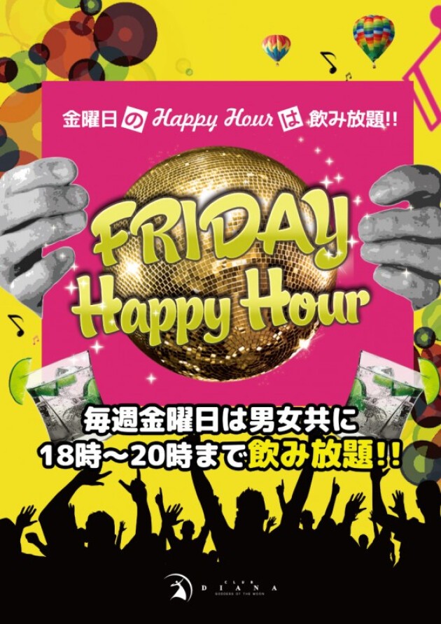 最新のヒット曲中心に、クラブ初心者の方でも安心して遊んで頂けるようにスタッフ一同心よりおもてなし致します。女性一人でも来店しやすいと安心感があって評判なCLUB DIANA。金曜日は名物の大スクリーンでVJ映像やMusicPVを楽しむもよし、マスコミにも取り上げられたスーパーお立ち台「DIANA RUNWAY」で優雅に踊るもよし。皆で乾杯できるFree Tequila Timeもあって、多くの人で賑わい、ラグジュアリー感溢れるCLUB DIANAのFRIDAY NIGHTにいつもよりちょっとオシャレしてご来店下さい・・・