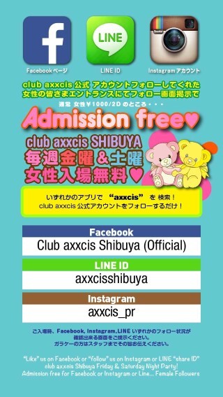 ※女性限定!Facebook, InstagramID,LINEいずれかの club axxcis公式アカウントフォローで女性入場無料!!!