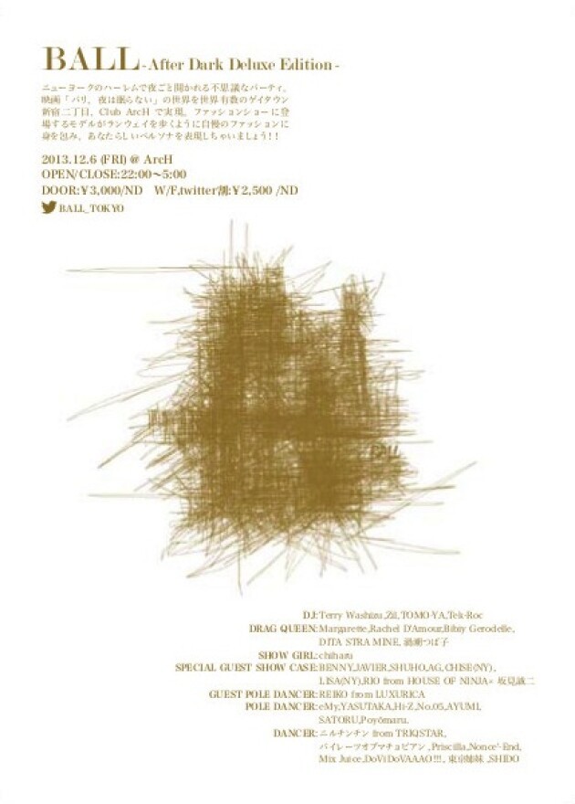 NYCのゲイカルチャーの中で生まれたDANCEである「VOGUE」 そのシーンの中で生まれた「HOUSE」(チームや家族を指す)の中でもカリスマ的な位置にあるのが「HOUSE OF NINJA」である。 今回のBALLでは、国内外からHOUSE OF NINJAの主要メンバーを招き、ストリートダンス界のカリスマと言われ、日本に於けるダンス市場の仕組と土台を築いた人物といわれている坂見誠二とによる夢のコラボレーションショーが実現! さらに、2005年オランダで開催されたポールダンス世界大会MISS POLE DANCEで日本 人として史上初の世界チャンピオンとなったLUXURICAのREIKOによるショーと BALLの集大成ともいえる伝説の夜になることでしょう!!