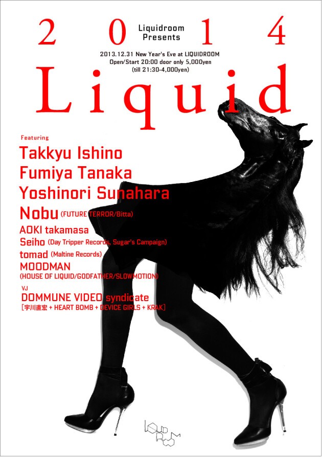 師走に<日本最長の新年祝賀の儀>が遂に解禁!!!!!! やって参りました!!!!!!!! 石野卓球師匠&田中フミヤ先生&Nobu師範!そしてマリンにMOODMAN、AOKI takamasa、tomadやSeihoまで集結し、我々DOMMUNE VIDEO syndicateが視覚を飾る恒例のネヴァーエンディングカウントダウン=「2014LIQUID」!更にはLIQUID LOFTをH.O.LとDOMMUNEが籠城しての「HOUSE OF LIQUIDOMMUNE」!!!!! Mixrooffice時代から数えると、最早8年目…恒例行事ともいえるLIQUID ROOMへの年末年始のお引っ越しが、今年も実現致します!!!!!!! 毎度の如く序夜の鐘に全く耳を傾けることなく、108のイーブンキックを打ち続ける、あのイニシエーションを本年も遂行しようと企てているのです!!!!! そう、2010年の3月1日のSTUDIO開局以来、ファイナルメディアを銘打った我々DOMMUNEが、ライヴストリーミングを遂行しない、モザイク儀礼がこの「HOUSE OF LIQUIDOMMUNE」なのです!!!!!!!! 今年も去年に引き続きリキッドルーム内にオープンしたギャラリースペース=KATAも解放し、現在テクノの潮流である深海DOPEミニマル&エクスペリメンタルフロアとして潜り、荒れ続ける【KATA x HOUSE OF LIQUIDOMMUNE「DOPE DORONE EXPERIMENTAL」】と、LIQUID LOFT側は、なんとゲストにEYヨとMOODMANを迎え、2013年の2大イニシエーション・ビーツであったJUKEとGORGEが激突する【HOUSE OF LIQUIDOMMUNE「JUKE vs GORGE」】!年始早朝には、ECDやNOEL&GALLAGHER、田我流、OMSB、そして漢&プライマル&DJ琥珀…他数十組が乱れ咲き、混沌ドメスティック・オルタナティブとして炸裂する【HOUSE OF LIQUIDOMMUNE「DOMESTIC NEU! BREAKS」】の陰陽両刀使い!!!!!!!!!!! つまり20時間超えのWスペースに10時間超えのブラックホールが人工肛門のように増設され、全フロア総計50時間を越えるタイムテーブルが並列時間軸を刻む、恐るべきカオスモス空間を迎春の四つ打ちトライアスロンが駆け抜けます!!!!!!!!!!(ギネス申請中!!!!!)是非今年も"歪んだ気持ちでの参賀" 何卒よろしくお願いいたします!!!!!!!!!!!!!!!!!!(宇川直宏 & LIQUIDROOM & DOMMUNE 一同より)