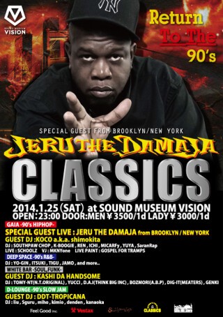 「ヒップホップの黄金期」と称される90年代にフォーカスし、良質な音の磁場をオーディエンスに提供し続けて、前回ついに8周年の祝祭を迎えることとなった“CLASSICS”。The BeatnutsやJAZZYJEFFというレジェンド級のゲストを迎えた最近の開催では動員記録を連続更新するなど、その熱気はますますパワーアップしつつある。そして9年目のスタートであるこの夜、またしても魅惑のメインアクトの登場が決定した。Jeru the Damajaは、DJ Premierとともに90年代のNYを席巻し、つねにアンダーグラウンドにこだわった創作活動を貫き通してきたアーティストである。唯一無比のパフォーマンスを、絶対に見逃すな。