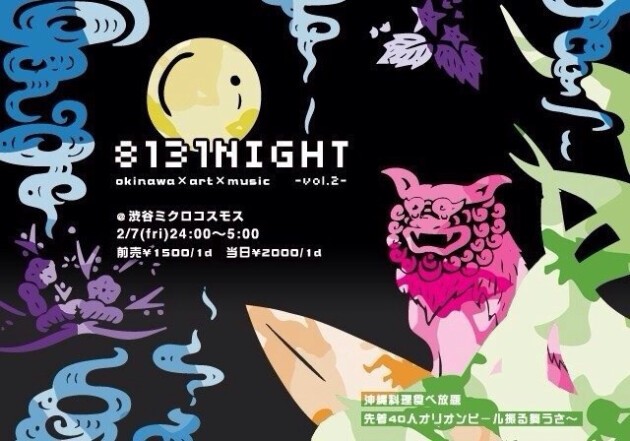 はいさーい!ぐーすーよー、ちゅううがなびら??渋谷に沖縄だよ~!!」(元気?みなさんいかがおすごしですか?渋谷に沖縄が出現だよ~!) 寒くなってまいりましたが8131NIGHTはあちさんさんさ~。 日本の宝島「沖縄」「沖縄」というキーワードに若者が集結。感性豊かなアート・音楽・デザイン・ファッション等を通じて「お~きな輪」になり繋がり広がることをコンセプトに開催したセッションイベント!!数量限定沖縄料理食べ放題あい、先着限定オリオンビールサービス