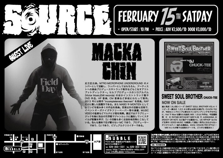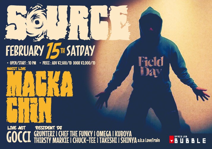 6年半ぶりになるアルバムIncompleteness TheoremをリリースしたMACKA-CHINを招聘しGOOD MUSICを追求したパーティー”SOURCE”開催!!DJに今回のアルバムのプロデューサーでもあるGRUNTERZも出演決定!!