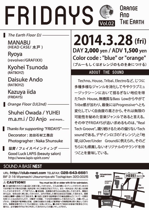 Techno、House、Tribal、Electroなど、じつに多種多様なジャンルを消化して今やクラブミュージックシーンにおいて揺るぎない地位を得たTech House。無機質なBass LowからやがてTribe感が加わり、最後にはProgressiveへとも変化していく自由度の高さから、それは無限の可能性を秘めた音楽ジャンルであると言える。その中でFRIDAYSが追い求めるものは、"Real Tech Groove"。踊り続けるための偏りないTech soundである。デザインロゴの「オレンジ」と「地球」はOver/Under Groundに例えられ、そのどちらにも帰属しないオリジナルのサウンドを持つことを意味している。