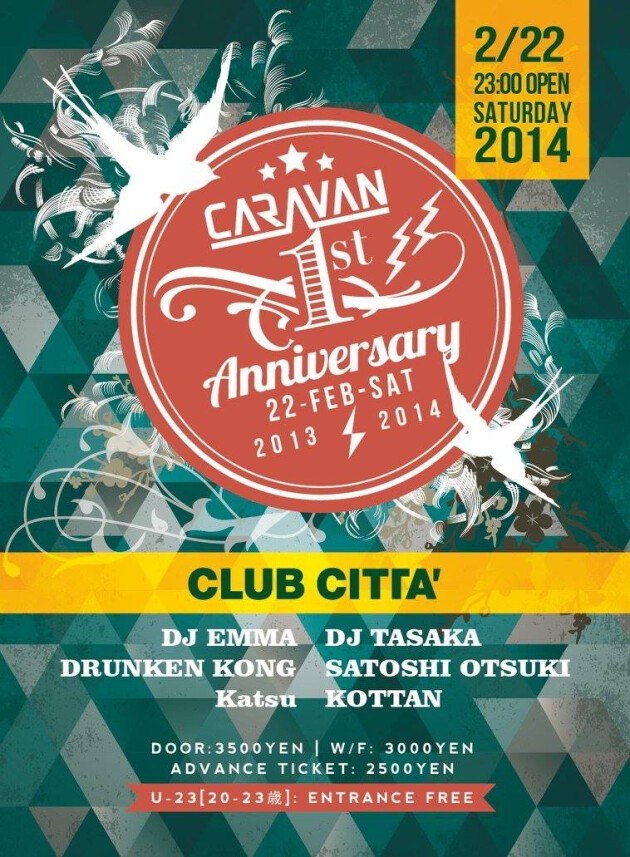 昨年のグランドオープニングパーティーから早1年。 CARAVAN 1st ANNIVERSARYの開催が決定致しました! 前回のHELLO FREAKSにも出演し、KING OF HOUSEの称号で絶大な人気を誇る【 DJ EMMA 】が再びクラブチッタの舞台に降臨。 そして抜群のテクニックでHOUSE、DISCO、MINIMALからHIPHOPまで、あらゆるジャンルを自在にクロスオーバーさせる次世代テクノDJ【 TASAKA 】も参戦! また都内や海外でも活躍中の【 DRUNKEN KONG 】、TRESVIBESの【 SATOSHI OTSUKI 】も迎え、バリエーション豊かな豪華内容でお送りします。 更に今回もATTIC BAR、DEEP SPACEの計3フロアを展開。 ベテランからニューカマーまで、シーンを盛り上げ続けるラインナップもお見逃しなく! 皆様のご来場、心よりお待ちしております★