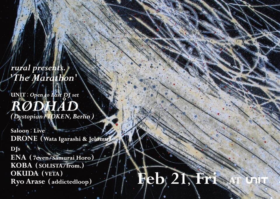 今や夏の風物詩となったオープンエアパーティ"rural"がこの冬お届けるのは、ベルリン最注目のパーティ兼レーベル"Dystopian"を代表するアーティスト、RØDHÅDによるOpen to Last DJ set、その名も「The Marathon」。 RAによる「Top DJs of 2013」にも堂々ランクインし、何より初来日となった"rural 2013"での叙情的な素晴らしいPlayも記憶に新しいRØDHÅDによるLong Setは、改めてテクノミュージックというものの素晴らしさを広義、狭義の視点から、長いストーリー性と共に我々に提示しくれるだろう。 またSaloonを彩るのは、"Dystopian"とも交流の深いENA、アナログ機材とデジタル機材のハイブリッドでLive Setを披露するWata Igarashi&JelomuによるDrone、更にruralを支えるaddictedloop/VETA/SOLISTAからはRyo Arase/OKUDA/KOBAの3名がDJ Setにて登場する。