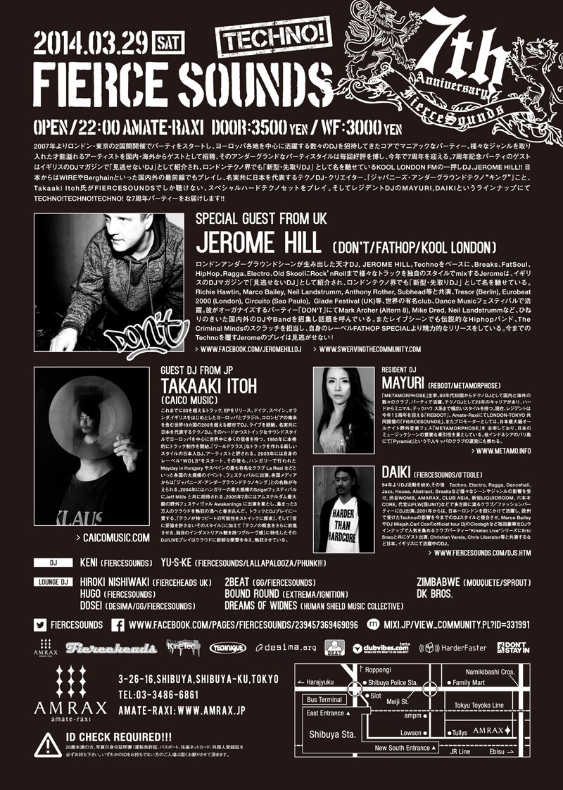 日本からはWIREやBerghainといった国内外の最前線でもプレイし、名実共に日本を代表するテクノDJ・クリエイター、『ジャパニーズ・アンダーグラウンドテクノ“キング”』こと、Takaaki Itoh氏がFIERCESOUNDSでしか聴けない、スペシャルハードテクノセットをプレイ。そしてレジデントDJのMAYURI,DAIKIというラインナップにてTECHNO!TECHNO!TECHNO!な7周年パーティーをお届けします!!