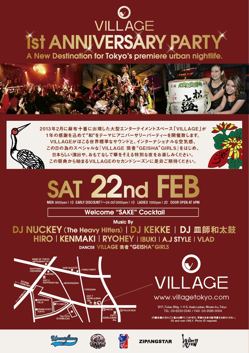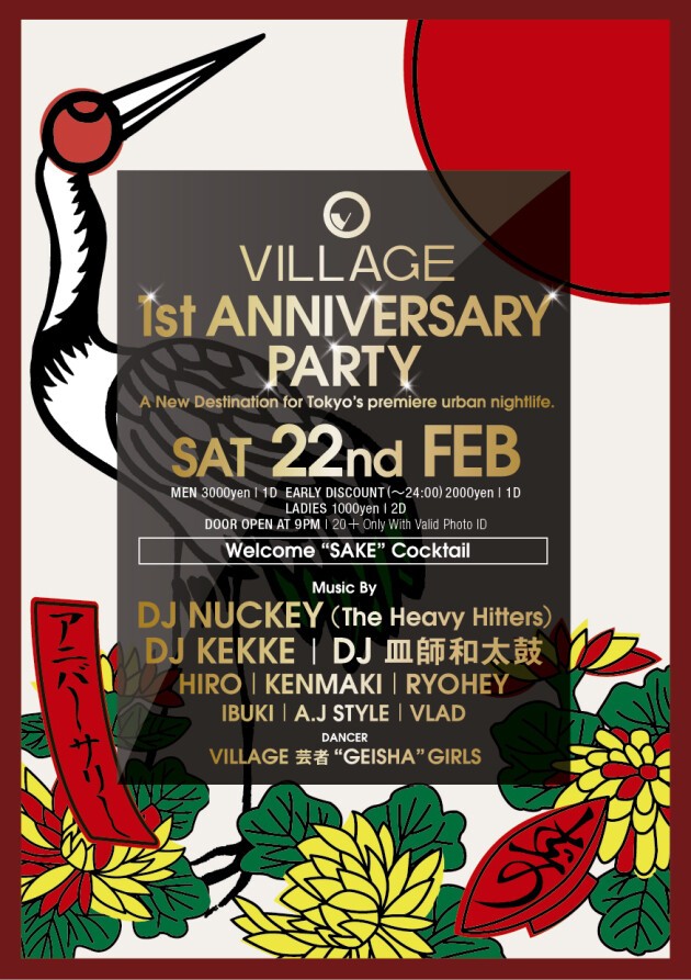 2013年2月に麻布十番に出現した大型エンターテイメントスペース「VILLAGE」が1年の感謝を込めて “和”をテーマにアニバーサリーパーティーを開催致します。VILLAGEが誇る世界標準のサウンドと、インターナショナルな空気感、この日の為のスペシャルなダンサー『芸者“GEISHA” GIRLS』 をはじめ、日本らしい演出やおもてなしで華を添える特別な夜をお楽しみください。この祭典から始まるVILLAGEのセカンドシーズンに是非ご期待ください。
