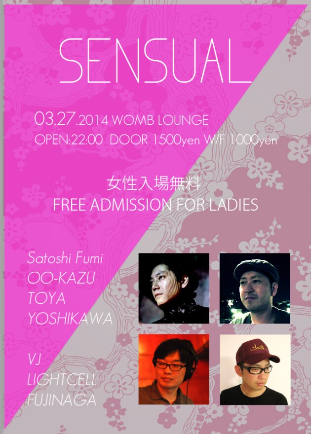 レジデントには TROUBLE HOUSE にも参加している OO-KAZU を加え、都内各所で活躍するアーティストと共にディープテックハウス旋風を巻き起こす!WOMB LOUNGE ならではの密度の高い空間での Satoshi Fumi のプレイは必聴必見。3年目に突入しさらに進化したSENSUAL のグルービーでフレンドリーな空間をぜひ体感して欲しい!