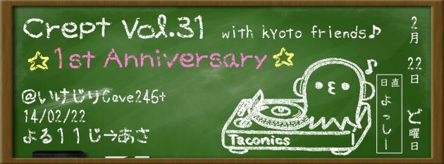 Guest DJには、京都からCrept京都支部長ON-CHANG、そしてNagaimann、東京からKJ aka DJ PATROL、TETSUO。合わせて4人を迎えて、Crept1周年を盛大にお祝いします!!!
