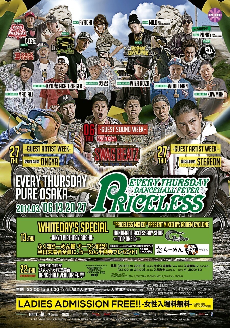 「PRICELESS」は、REALなREGGAE DANCEHALL MUSICはもちろん、HIP HOPやR&B、SOUL等も幅広くPALY!!全ての人達が楽しめる空間です。
