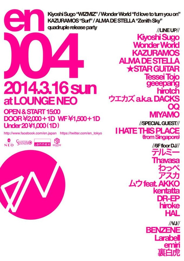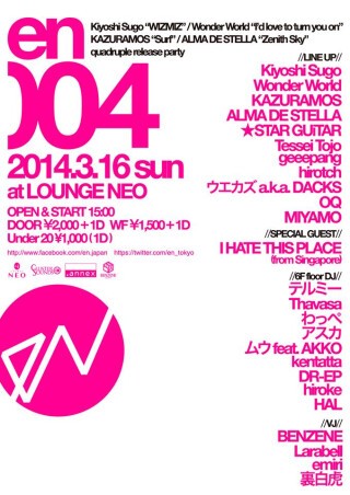 Kiyoshi Sugo “WIZMIZ” / Wonder World “I’d love to turn you on” / KAZURAMOS “Surf” / ALMA DE STELLA “Zenith Sky” の4組のリリースを祝し、2014年3月16日「en004」にて合同リリースパーティーを開催!!