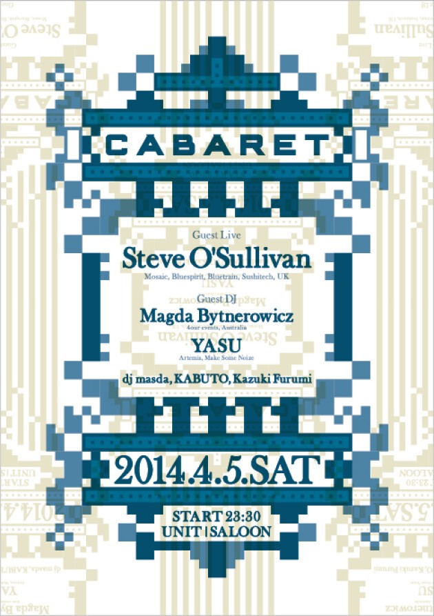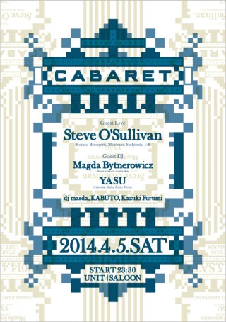 過去、Daniel Bell、CASSY、ATA、FARBEN a.k.a Jan Jelinek、Barbara Preisinger、Pole、Jan Krueger、Vera、Eli Verveine、Binh等、全くぶれのない視点でゲストを招聘し、独自の視点でクオリティパーティを提供してきた【CABARET】。今回はMosaic、Bluespirit、Bluetrain等の伝説的レーベルのオーナー、Steve O'sullivanが満を持して登場。