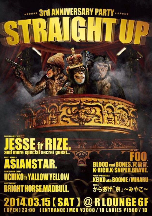 奇数月第3土曜日にREGGAEとHIPHOPのMIX UPをテーマに、SHIBUYA R LOUNGEで開催されてきた、STRAIGHT UP(ストアプ)が3周年!!!!