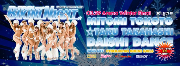 全国各地をツアー中の大人気パーティーCYBERJAPAN "BIKINI NIGHT"が遂にウィンター・シーズンのファイナルを迎える!今回は3/12に発売になる"BIKINI NIGHT"のCD+DVDのリリースパーティーとしても開催!! レジデントDJのMITOMI TOKOTOの他、☆Taku Takahashi、DAISHI DANCEという強力なゲストが間違いのない一夜を約束する。更にビキニ着用の女性の方は入場無料!!CYBERJAPANビキニガールズと共に寒さを吹き飛ばして熱く盛り上がろう!
