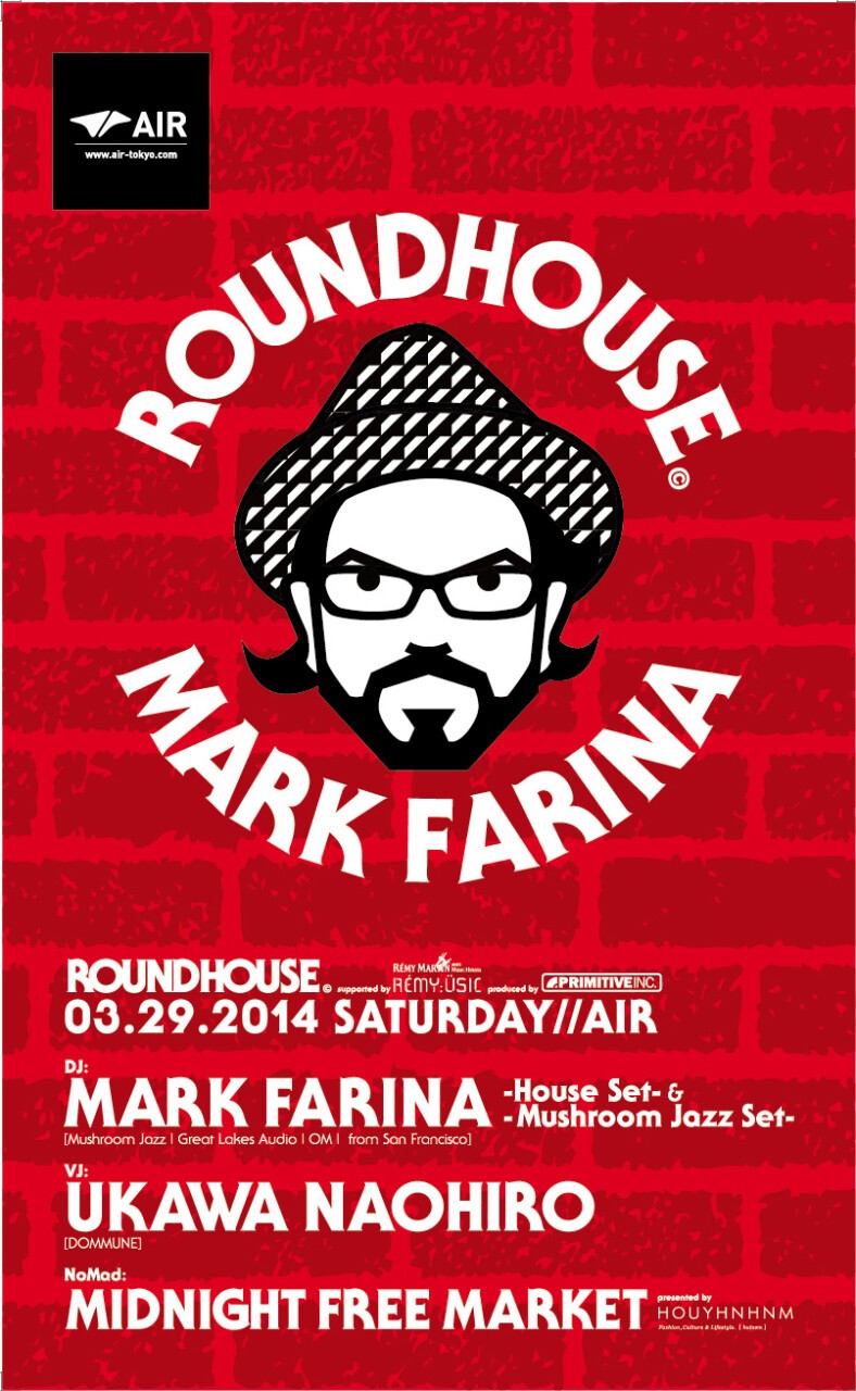 東京の最前線で本物のアーティストを紹介し続けているPRIMITIVE INC.がプロデュースするパーティー“ROUNDHOUSE”がRÉMY:ÜSICのサポートのもと始動する。キックオフを飾るDJは魂の解放者ことMark Farina。抜群の選曲と類まれなグルーヴでキャリアを積み上げ、世界中から絶大な支持を受けるDJとして知られている。今回は真骨頂のHOUSE SETのみならず、ダウンテンポなサウンドを西海岸スタイルで紡ぐMUSHROOM JAZZ SETをラウンジでも披露。Mark Farinaならではの二面性を一晩で存分に味わえる貴重な機会になっている。更に日本が誇る奇才芸術家、宇川直宏がレジデント(?)VJとして“ROUNDHOUSE”に参加。サンフランシスコに住んでいた20年以上前にMark FarinaのDJで踊り明かしていた原体験を持つ宇川直宏とのコンビネーションは特別な時間を期待させてくれる。音楽を軸に様々な文化が繋がっていく一夜。それは黎明期のクラブが多く持っていた熱量の源。古きをたずねて新しきを知る。踏襲しながらも刷新すべく“ROUNDHOUSE”がスタートする。