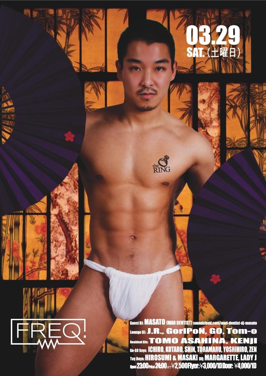 めっきり春らしくなってまいりましたが、ますますご発展の事お喜び申し上げます。今年もまた桜が咲き始めます。春と共に、ザ・リングも長い冬眠から目覚めます。会場はハロウィン・大晦日で盛り上がった場所ですが、FREQと名前を変えて、更にパワーアップしました。今回のテーマは花見に舞い降りた純和風美少年です。彼はセクシーでやんちゃな弟子を募集中です。美少年ぶってる傲慢兄貴を探しているあなた、最終土曜日は新天地・FREQへ足を赴けてはいかがでしょうか。蕾がひらく男色の道、みなでそぞろに、西麻布へ!