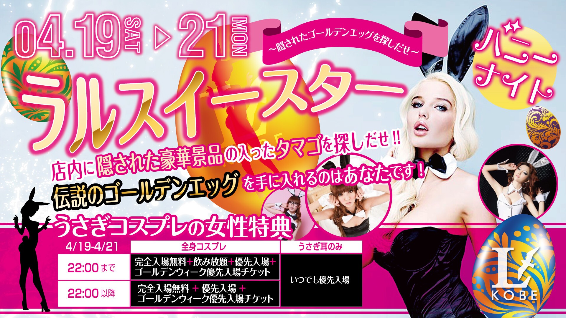 LARUS KOBEは、22時までのご入場で、「毎日 全員入場無料!!」
