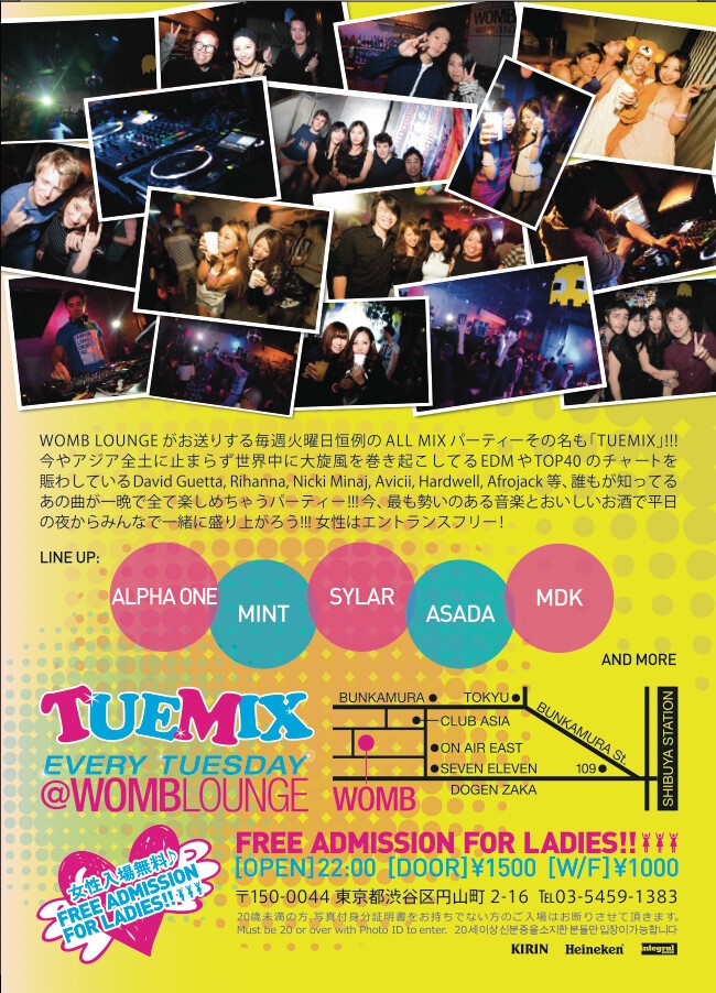 WOMB LOUNGE がお送りする毎週火曜日恒例の EDM パーティーその名もTUEMIX!!!今やアジア全土に止まらず世界中に大旋風を巻き起こしてる EDM や TOP40 のチャートを賑わしてる Alesso、Hardwell、Rihanna、Nicky Romero、Avicii、Calvin Harris 等、誰もが知ってるあの曲が一晩で全て楽しめちゃうパーティー!!!今、最も勢いのある音楽とおいしいお酒で平日の夜からみんなで一緒に盛り上がろう!!! 女性はエントランスフリー!